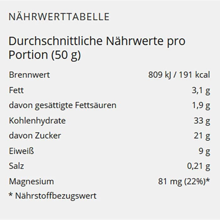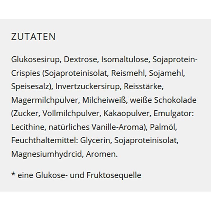 Zutaten: Glukosesirup, Dextrose, Isomaltulose, SOJAPROTEIN-Crispies (SOJAPROTEINISOLAT, Reismehl, SOJAMEHL, Speisesalz), Invertzuckersirup, Reisstärke, MAGERMILCHPULVER, MILCHEIWEIß, weiße Schokolade (Zucker, VOLLMILCHPULVER, Kakaopulver, Emulgator: Lecithine, natürliches Vanille-Aroma), Palmöl, Feuchthaltemittel: Glycerin, SOJAPROTEINISOLAT, Magnesiumhydrcid, Aromen