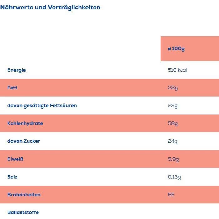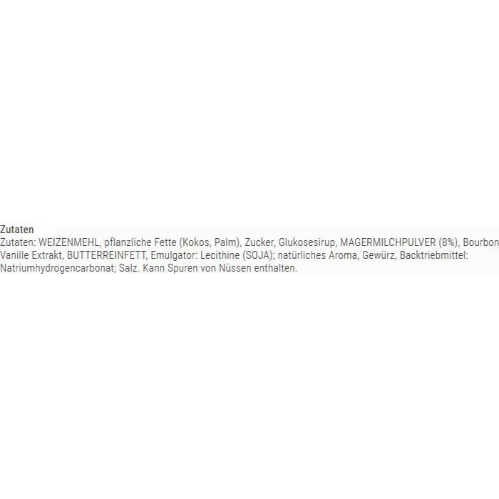 WEIZENMEHL, pflanzliche Fette (Kokos, Palm), Zucker, Glukosesirup, MAGERMILCHPULVER (8%), Bourbon Vanille Extrakt, BUTTERREINFETT, Emulgator: Lecithine (SOJA); natürliches Aroma, Gewürz, Backtriebmittel: Natriumhydrogencarbonat; Salz
