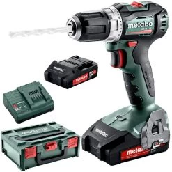 Lieferung: inkl. 2 Li-Ion Akkus, Ladegerät SC 30, Schnellspannbohrfutter, Gürtelhaken und Bitdepot, Transportkoffer metaBOX 145 BS 18