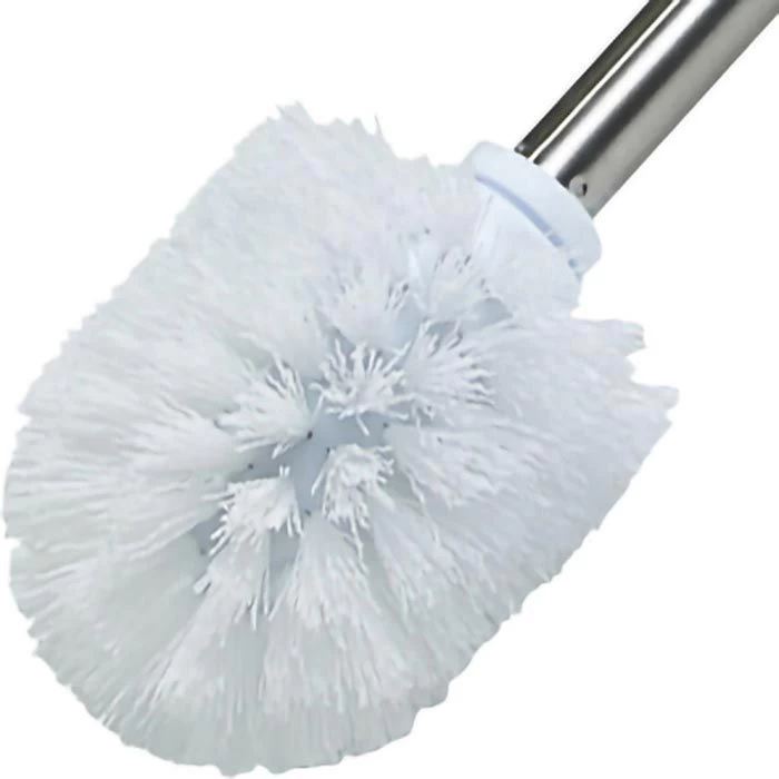 • Glänzender, rostfreier Edelstahlstiel mit wechselbarem, weißem Bürstenkopf